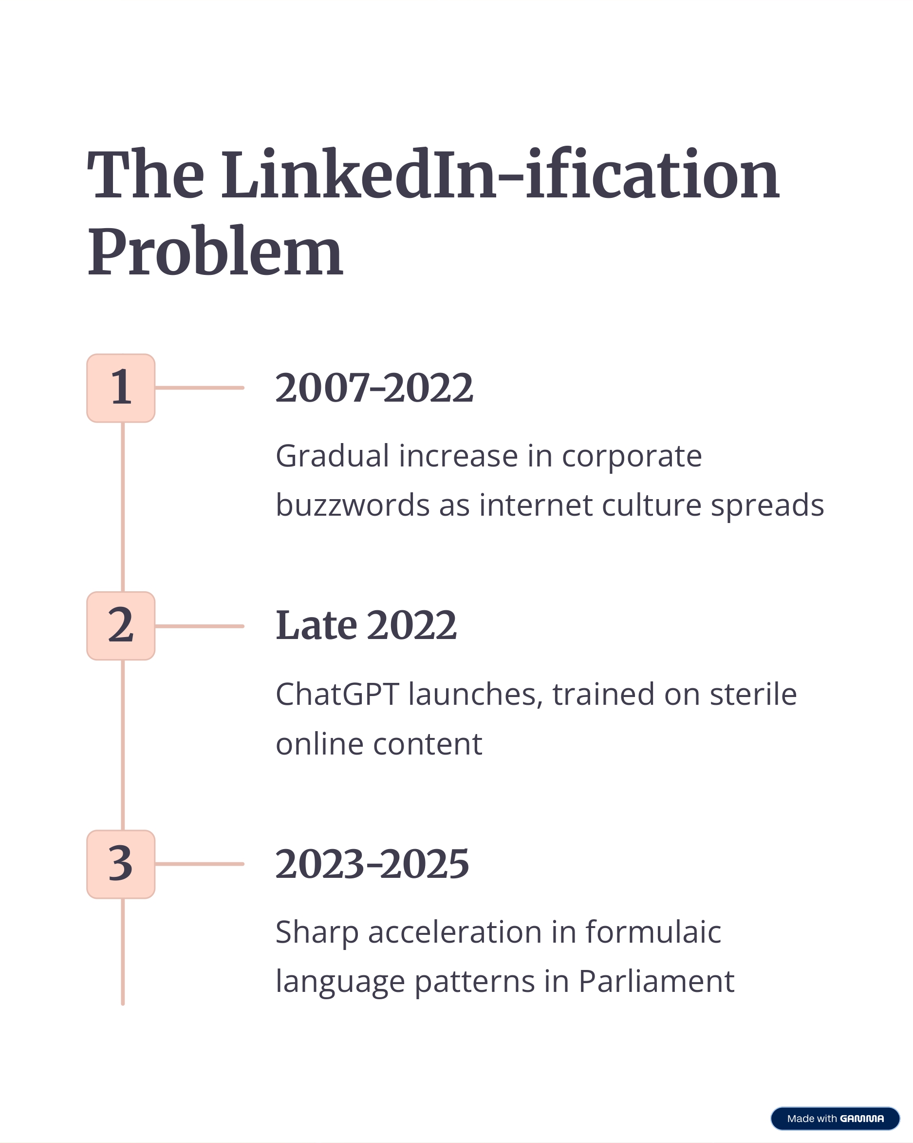 Pimplico Journal ran the numbers and found that the (over)use of these words, largely due to AI-written posts, has skyrocketed in the UK House of Commons.